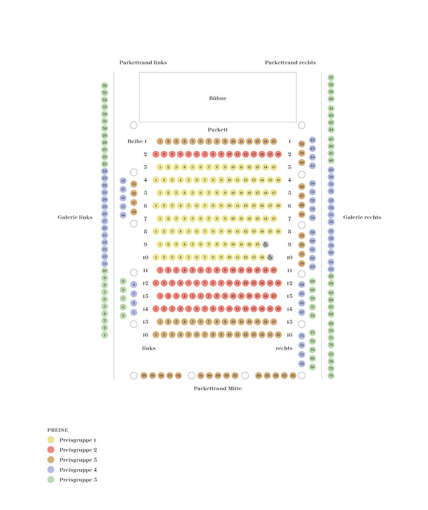 | Preisgruppe | PG I | PG II | PG III | PG IV | PG V | Hör-/Stehplatz |
