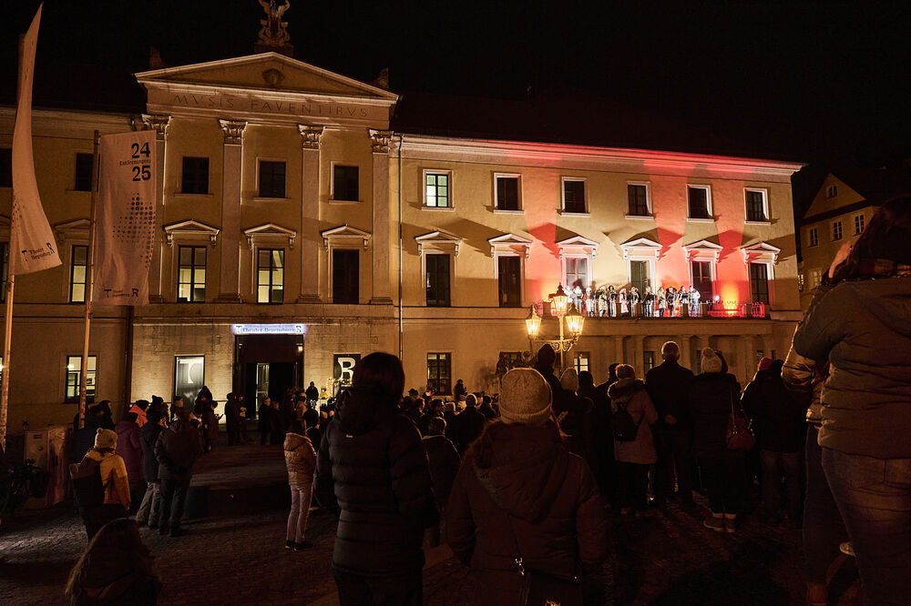 Am Mittwoch, den 5.2., fand auf dem Bismarckplatz um 21:30 Uhr ein ganz besonderes Balkonsingen statt. Ausnahmsweise war schon vorher bekannt, was am Abend gesungen werden sollte und ausnahmsweise standen mehr als drei Sänger*innen auf dem Balkon. Der gesamte Cast von COME FROM AWAY performte vor gut 500 Menschen an diesem kalten Abend Ausschnitte aus dem Stück. Direkt zu Beginn mit WELCOME TO THE ROCK schwappte die ganze Energie auf das Publikum über. Egal, ob sie die Musik schon hundert Mal gehört haben oder gerade zum ersten Mal hören: Song für Song wird immer klarer, wer noch kein Ticket hat, muss sich sofort eins holen. Das Restkontingent ist knapp.